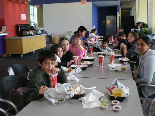 Many thanks to Drew Elko of Sodexho foods who gave discounts to the 45 EBLO artists for their meals (and who made sure that the service was super fast!)! Thanks also to the Shriver Center who picked up the tab for the hamburgers, fries and drinks that each student ate! The kids loved the food, the fast service, and the college atmosphere.